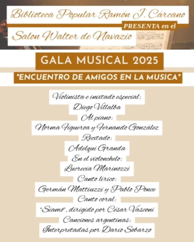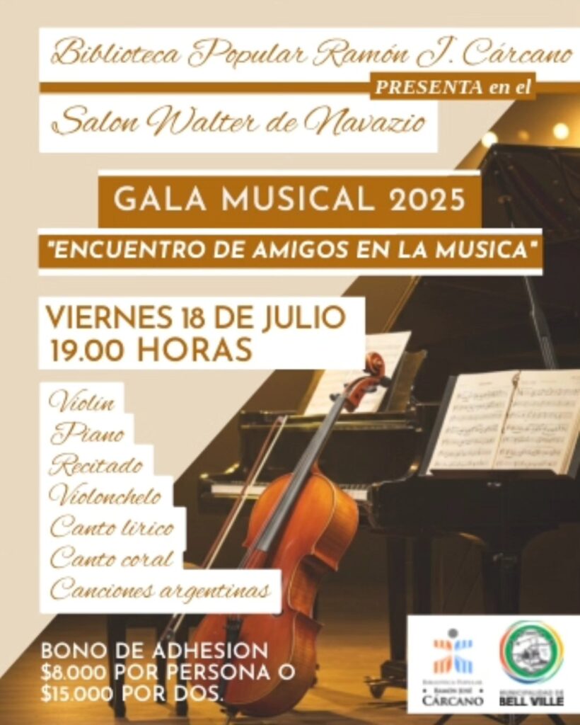 Diego Villalba (violín – invitado especial) Norma Figueroa y Fernando González (piano) Adelqui Granda (recitado) Lucrecia Marinozzi (violonchelo) Germán Mattiuzzi y Pablo Ponce (canto lírico) Coral “Siamo” dirigido por César Vasconi Canciones argentinas interpretadas por Darío Sobarzo Bono de adhesión: $8.000 por persona | $15.000 por dos Una propuesta cultural para compartir, emocionarnos y seguir haciendo comunidad a través de la música. ¡Te esperamos! #GalaMusical2025#EncuentroDeAmigos#Bibliotecapopular#BellVille#MúsicaEnVivo#CulturaParaTodos @municipalidad.bellville