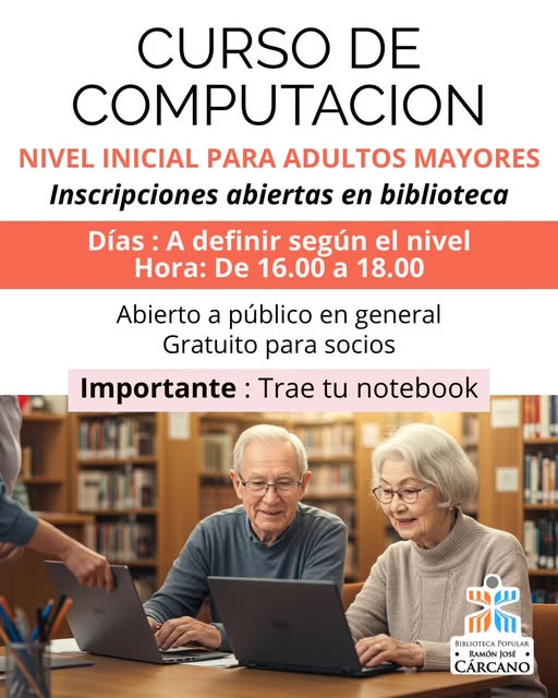 Curso de Computación – Nivel Inicial para Adultos Mayores Dictado por el profesor Luis Báez. Organiza: Biblioteca Popular Ramón J. Cárcano ¡No te lo pierdas! Aprendé a usar la compu desde cero en un espacio amigable y a tu ritmo. Días a definir según el nivel Horario: de 16:00 a 18:00 hs Inscripciones abiertas en la biblioteca Abierto a todo público Gratuito para socios Importante: Traé tu notebook #bibliotecapopular#cursodecomputación
