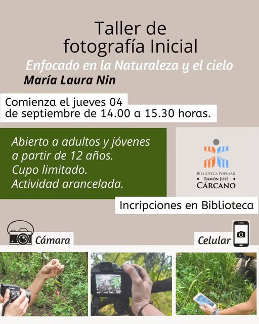 Taller de Fotografía Inicial Enfocado en la Naturaleza y el Cielo Dictado por María Laura Nin Comienza Jueves 04 de septiembre De 14:00 a 15:30 hs En la Biblioteca Popular Ramón J. Cárcano Será una vez a la semana Un espacio para descubrir y capturar la belleza del cielo y la naturaleza Abierto a adultos y jóvenes a partir de 12 años Podés participar con cámara o celular Cupo limitado Actividad arancelada ¡No te pierdas esta experiencia creativa! Inscripciones en la Biblioteca @con_ciencianativa #tallerdefotografiainicial#bibliotecapopular